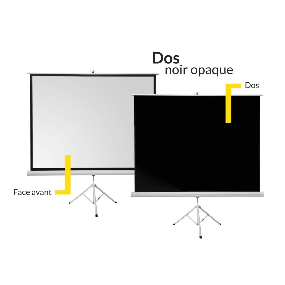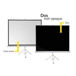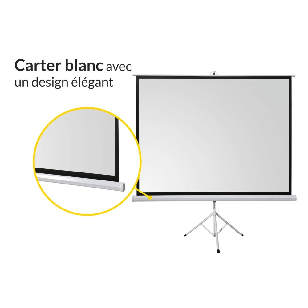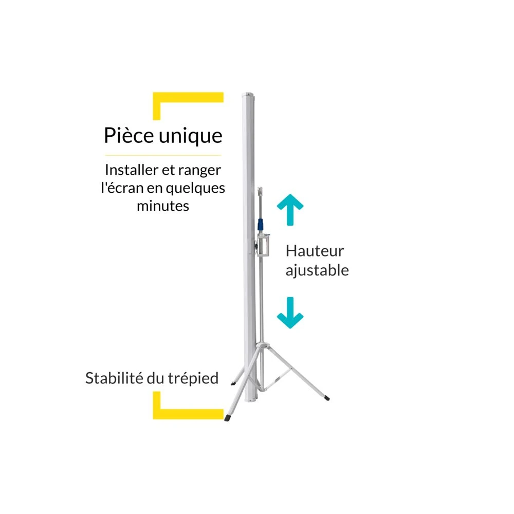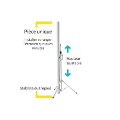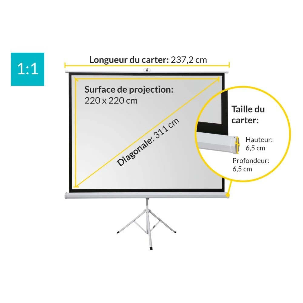 Notre Ă©cran de projection sur pied se monte rapidement et se transporte facilement grâce Ă sa lĂ©gèretĂ©. Il est conçu pour une utilisation mobile.Naturellement, toutes les utilisations sont possibles : Home-CinĂ©ma, diffusion d’Ă©vĂ©nements sportifs en extĂ©rieur, etc…Cet Ă©cran peut ĂŞtre fixĂ© Ă diffĂ©rentes hauteurs et s’adapte ainsi Ă plusieurs formats diffĂ©rents sans problème. Il est conçu pour toutes les technologies de vidĂ©oprojecteur (telles que LCD, DLP, LCOS, LED, OHP, etc).Le dos noir opaque garantit qu’il n’y ait aucune perte de lumière ou qu’aucun rĂ©sidu de lumière n’interfère sur l’Ă©cran. Ainsi, la projection est toujours uniformĂ©ment lumineuse. Les bords noirs amĂ©liorent le contraste. La toile est de type D avec un facteur gain de 1,5 et rĂ©flĂ©chit la lumière sur tous les cĂ´tĂ©s. La toile en polyester Ă deux couches offre une planĂ©itĂ© et une stabilitĂ© parfaites.Grâce Ă sa structure très fine, il est possible d’utiliser cet Ă©cran mobile pour les contenus Full-HD ou 3D.CaractĂ©ristiques:Surface blanche utile: 220 cm x 220 cmDiagonale max : 311 cmDimensions du carter : 237,2 cm x 6,5 cm x 6,5 cm (Longueur x Hauteur x Profondeur)Couleur du carter: blancDos opaque et noirFormat 1:1Format qui s’adapte pour d’autres formats tel que le 16:9, 16:10 et le 4:3Plusieurs crans de bloquageMontage facilePoids : 16 kg
