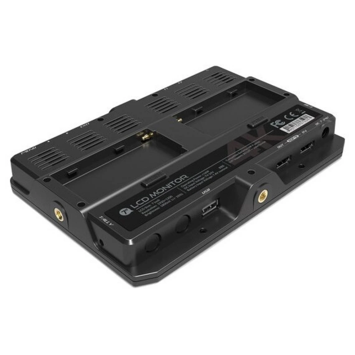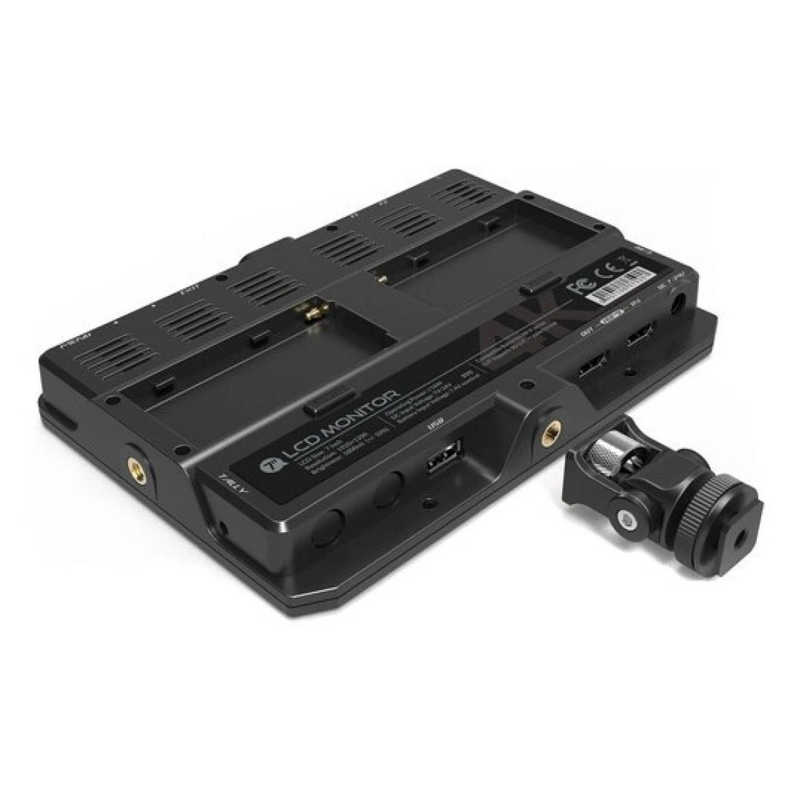 Il est doté d’un filetage ¼ se trouvant à la base et sur un côté afin d’y fixer la griffe qui est inclus pour une inclinaison à 180° et une rotation à 360°. À l’arrière du moniteur se trouve une double plaque de batterie de la série L afin que vous puissiez alimenter le moniteur pour vous permettre une grande autonomie. Il comprend divers boutons qui vous permettent de choisir entre les options proposées mais aussi de personnaliser des raccourcis grâce à des boutons définissables F1 et F2.